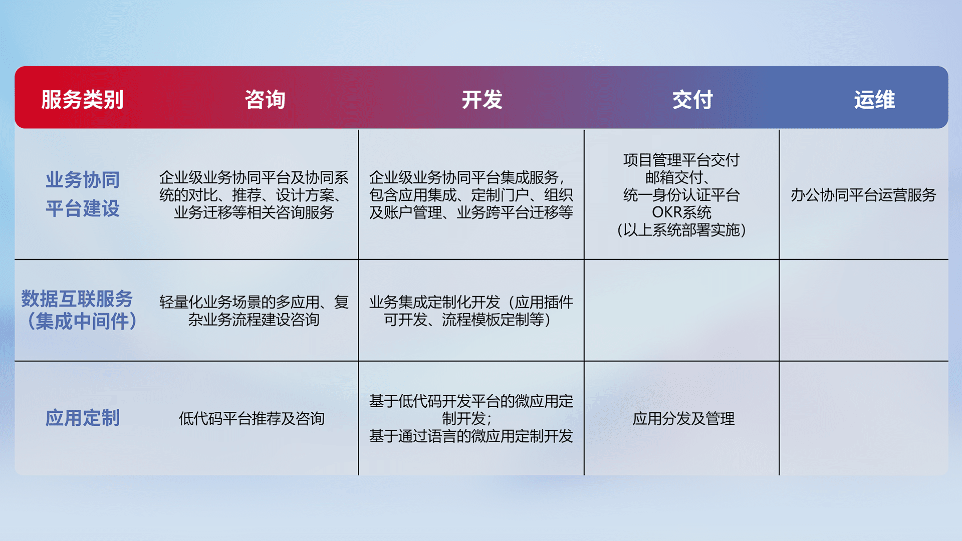 针对钉钉、、、企微、、IDaas等平台级产品提供产品的规划、、方案、、、、交付、、、定制化开发等服务,,实现如统一协同办公、、、、智能客户服务、、、混合会议管理、、智能数据查询、、、、等业务场景,,,,实现数字化转型。。